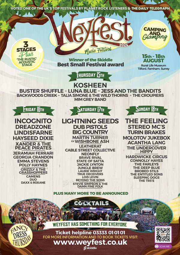 Weyfest is a premium boutique-style festival held in Tilford, Surrey in August since 2007. At Weyfest you will experience fine foods, wines, ales, ciders and lagers, cocktails and champagne bars – all at reasonable prices.  There are plenty of posh CLEAN toilets that are topped up with supplies all weekend, a beautiful camp site with wonderful hot showers and great sound quality from the 4 stages, all set in 10 acres of stunning woodland of the Rural Life Museum – home to 40,000 fascinating artefacts of country life. There’s plenty to entertain all ages, quite apart from the fabulous music!